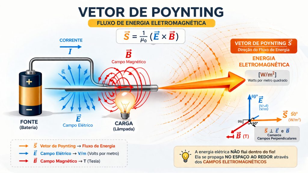 Em um circuito elétrico simples, como uma bateria conectada a uma lâmpada por fios, os campos elétrico e magnético não estão confinados apenas dentro do condutor. O campo elétrico se estende do terminal positivo para o negativo da bateria, enquanto o campo magnético circunda os fios, gerado pela corrente que flui. É na região fora dos fios, onde esses dois campos coexistem e são perpendiculares entre si, que o Vetor de Poynting aponta da fonte (bateria) para a carga (lâmpada), indicando o caminho real do fluxo de energia.